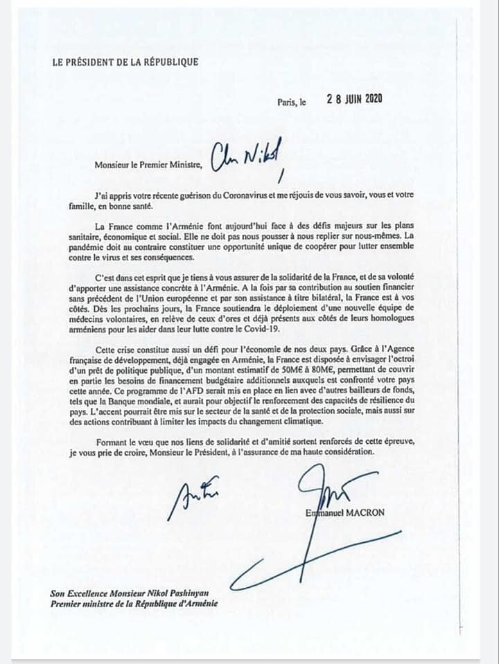Приписки от руки, внесенные в письмо президента Франции, направленное премьер-министру Армении Николу Пашиняну сделаны лично президентом Эммануэлем Макроном. Об этом в беседе с Арменпресс сказала пресс-секретарь премьер-министра Армении Мане Геворгян. “Не хотелось бы касаться этого вопроса, но ряд СМИ, часто, не имея весомых причин, продолжают прибегать к манипуляциям. В письме, отправленном премьер-министром Франции, внесенные от руки приписки сделаны лично президентом Макроном, что является общепринятой практикой при отправлении писем. Приписка “Cher Nikol” со стороны президента свидетельствует о теплых и дружеских отношениях лидеров двух стран. Кроме того, я хотела бы сообщить, что перевод телеграммы также был предоставлен французами. Я бы посоветовала воздержаться от лишенных содержания спекуляций и сотрудничать профессионально ”, - отметила Геворкян. 30 июня президент Франции Эммануэль Макрон направил письмо в поддержку премьер-министру Николу Пашиняну. Норайр Шогикян