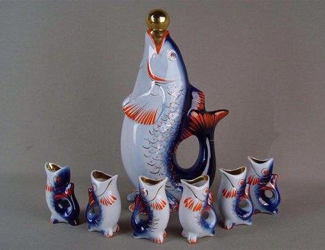 Помните фарфоровый штоф в виде рыбы с маленькими рыбками-рюмками, который можно встретить во многих советских интерьерах? У меня дома тоже есть такая рыба, от бабушки, причем в двух вариациях цвета. Производилась она массово на фарфоровом заводе в украинском городе Полонное в 1950-70 гг. В детстве я очень любил разглядывать эту синюю рыбку, ее изредка доставали из серванта, чтобы помыть от пыли, и только тогда мне удавалось на нее наглядеться, красивую, необыкновенную и загадочную рыбу с рыбятами. Каково же было мое удивление, когда я обнаружил очень похожий сосуд в коллекции Уоддесдонского музея! Японский фарфор очень ценился в Европе XVII-XVIII вв, настолько, что его обрамляли металлом, как редкий и ценный материал. Для чего предназначалась японская рыба Kakiemon 1680-90 гг. неизвестно, похожих предметов в каталогах найти не получилось, но когда она попала во Францию в 1700-е, ее использовали как парфюмерный фонтанчик. Хотя тоже наверное просто для декора, и какой-нибудь ребенок