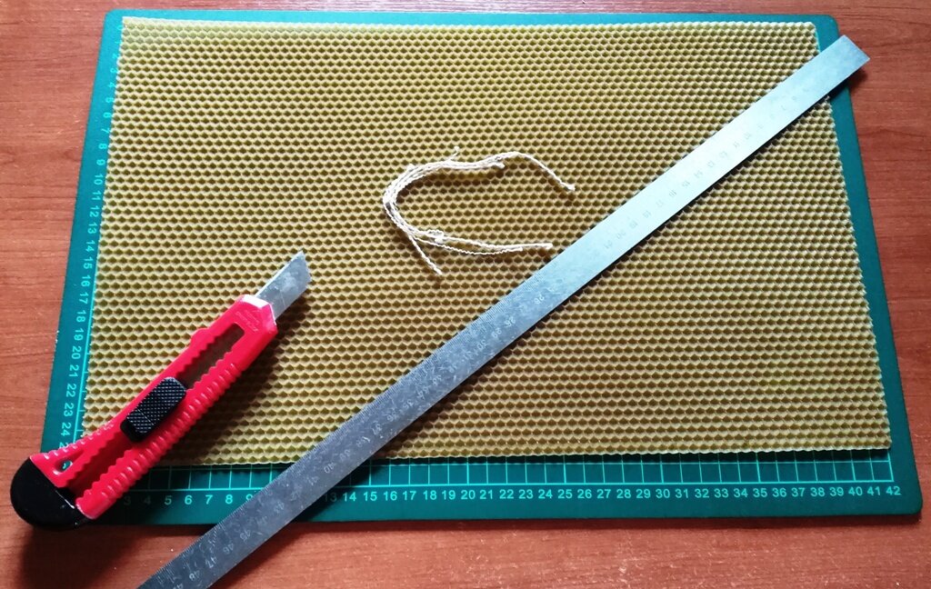 Прикладываем плотно линейку и разрезаем вощину на нужные нам полосы.