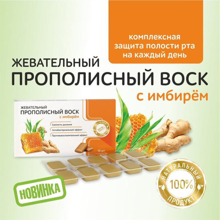 Изучаем новый продукт - Жевательный воск с прополисом и СО2 экстрактом имбиря. Слоган производителя – «Комплексная защита полости рта на каждый день!» 10 важных фактов о новинке! 1. Жевательный воск «рожден» про производстве «Эй-Пи-Ви». В процессе переработки нативного прополиса, «вытапливается» прополисный воск и всплывает на поверхность. Он пропитан всеми активными компонентами прополиса — фитонцидами, биофлавоноидами, эфирными маслами и жирорастворимыми витаминами. Именно эти компоненты дарят прополису мощные противовирусные, антикабтериальные и местнообезболивающие свойства. Санация носоглотки обеспечена! 2.В процессе изготовления нативного прополиса продукт проходит глубокую переработку по специальной технологии — это позволяет сделать продукт вкусным и ароматным с нотками хвои, тополя и душистых трав. 3. В продукте отсутствуют синтетические компоненты, а это значит, что продукт не несёт вреда окружающей среде (например, прилипшая синтетическая жвачка годами не удаляется с трот