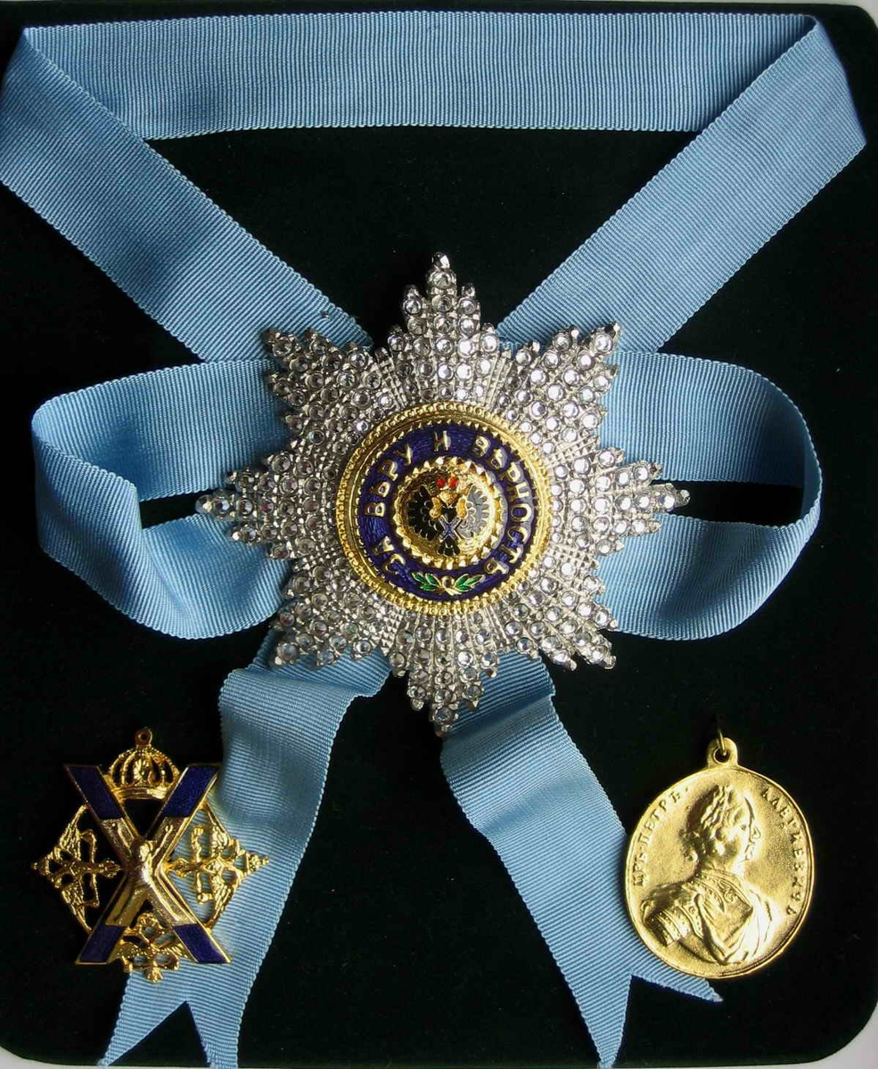 Знаки ордена Андрея Первозванного состояли из знака-креста, с изображением Св.Андрея Первозванного, на четырёх концах