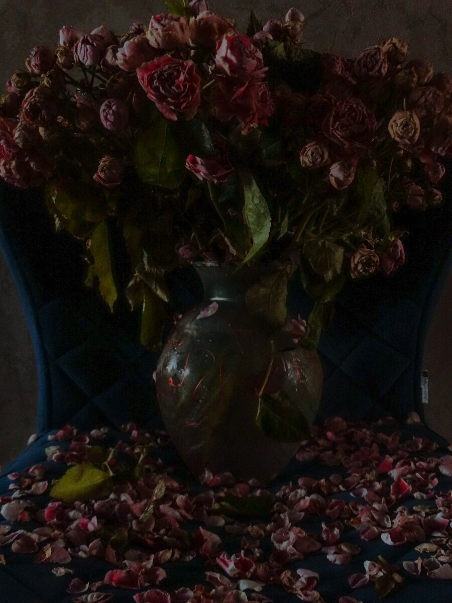 А вы знали, что увядающие цветы могут потрясающе выходить на фото и придавать особый шарм вашим фотографиям🥀 Так вот теперь вы знаете😇 Если вам подарили букет цветов, будь то тюльпаны или розы или пионы - не торопитесь его выкидывать, возьмите в руки телефон и сделайте несколько кадров📸 Можно немного потрясти букет, чтобы лепестки осыпались вокруг вазы, стола, может немного упали на пол, всё это придаст атмосферу вашей фотографии🥰 Тут к процессу подключилась даже кошка📸 Можно даже опрыскать из пулевизатора, для придания вот таких капель😜