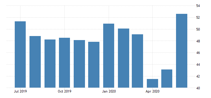 Производственный PMI ISM для США подскочил до 52,6 в июне 2020 года с 43,1 в мае, резко восстановившись с 43,1 в мае и 41,5 в апреле и легко превзойдя ожидания рынка 49,5. Чтение указало на самое сильное расширение деятельности завода с апреля 2019 года после трех месяцев подряд коронавирусных сбоев. Новые заказы (56,4 из 31,8), производство (57,3 из 33,2) и цены (51,3 из 40,8) восстановились, а занятость (42,1 из 32,1) и новые экспортные заказы (47,6 из 39,5) сократились меньше. "Спрос, потребление и вводимые ресурсы достигают паритета и позиционируются для цикла расширения за счет спроса, поскольку мы входим во вторую половину года",-сказал Тимоти Р. Фиоре, председатель Института управления поставками.