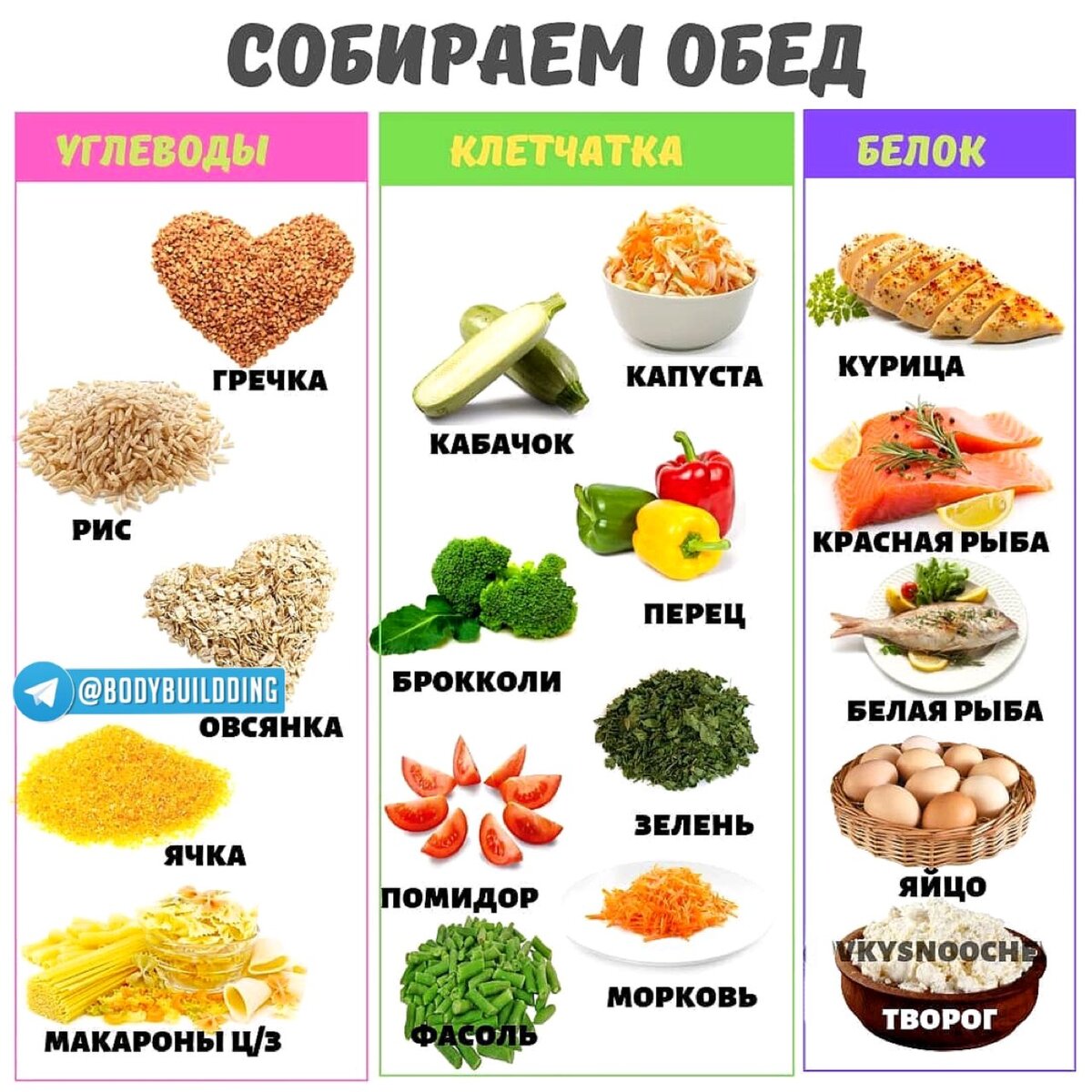Включаем: 1/2 часть Овощи: 🥦 Сюда входят все овощи – болгарский перец, помидор, брокколи, цветная капуста, кабачок, стручковая фасоль, морковь, огурец, баклажан и т.д. Можно есть в сыром виде, готовить на пару, тушить, запекать в духовке. 1/4 часть Белок: 🥚 Белок – мясо птицы, говядина, телятина, рыба (белая и красная), морепродукты (кальмар, креветки, мидии), яйца. Белок дает длительное чувство насыщения, к тому же он совершенно необходим организму. 1/4 часть Медленные углеводы:🍚 Медленные углеводы – это в основном крупы – гречневая, овсяная, булгур, ячка , бурый рис, а так же ц/з хлеб. Углеводы дают энергию и сытость на длительное время