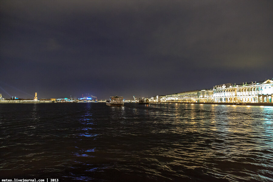 В километре от Дворцового моста подсвечивается Петропавловская крепость. Кстати, можно наблюдать очень интересный оптический эффект, с Дворцового моста крепость кажется существенно дальше, нежели чем Дворцовый мост с пляжа Петропавловки.