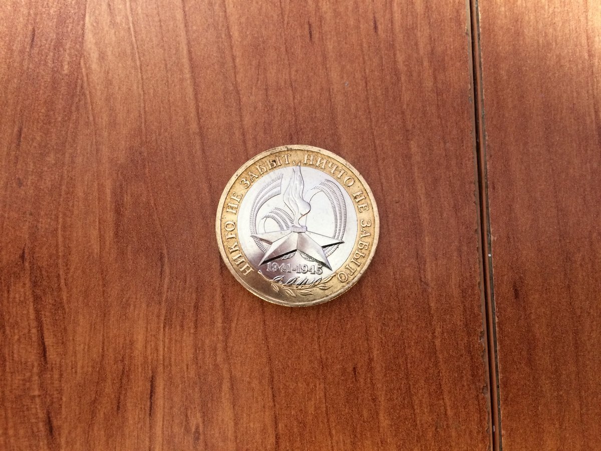 Наверняка, все мои читатели держали в руках эту монетку, а у многих она есть в коллекции. Как известно, к празднованию 60-ой годовщины Победы в Великой Отечественной войне была запущена целая серия монет "Никто не забыт, ничто не забыто". Среди этой серии есть как золотые, так и серебряные монеты. Ну и конечно же, биметалл. Тираж монеты составляет целых 60 миллионов(!) штук. Это в 6 раз больше средних тиражей памятных монет, поэтому неудивительно, что монета успела побывать в руках у каждого россиянина. Чекан производился на обоих монетных дворах. Монета состоит из никелевого диска с медно-латунным кольцом, поэтому примагничиваться она не может в принципе (если найдете магнитный экземпляр, то вам очень повезло). В центре диска аверса указан номинал монеты. Чуть ниже вензель монетного двора ( в моем случае ММД). На кольце внизу помещен год выпуска монеты (2005), а вверху надпись "БАНК РОССИИ". Основу легенды реверса составляет Вечный огонь, пылающий из пятиконечной звез