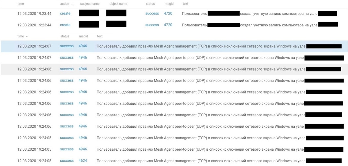 К сожалению, первая скомпрометированная машина была вне скоупа подключенных источников, поэтому момент запуска самого скрипта зафиксировать не удалось. Следом за созданием учетных записей мы зафиксировали изменение правил на локальном файерволе, которое разрешало использование определенного средства удаленного администрирования, а затем была создана служба агента этого самого средства. Кстати, антивирус, который использует заказчик, не распознает эту тулзу, поэтому мы контролируем ее по созданию соответствующей службы и запуску процесса.