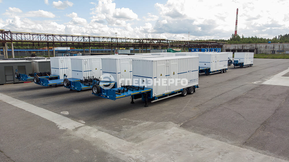 «СПЕЦЭНЕРГО» завершила производство трех комплектов двухтрансформаторных мобильных КТП (МКТП) для нужд ПАО «Ленэнерго». Мобильная КТП напряжением 10(6)/0,4 кВ, с двумя силовыми трансформаторами по 630 кВА, используется в качестве аварийного запаса. В случае повреждения основного (стационарного) оборудования подстанции, на время проведения аварийно-восстановительных работ, а также для реконструкции электросетевого хозяйства. Каждый комплект мобильной КТП состоит из двух теплоизолированных модулей, установленных на полуприцеп, внутри которых смонтировано основное и вторичное оборудование. В состав модуля входит: Мобильная КТП имеет универсальное исполнение, обеспечивая простоту и удобство пусконаладки и подключения основного оборудования к сети 10 и 6 кВ. Конструкция модулей предусматривает возможность проведения погрузочно-разгрузочных работ и транспортировку автотранспортом к месту монтажа без привлечения дополнительного спецтранспорта. РУВН 10(6) кВ выполнено на базе КРУ и состоит