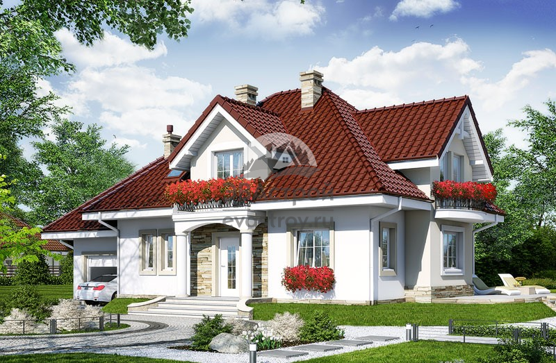 Проект узкого двухэтажного дома из керамоблоков с эркером и двухместным гаражом - SK-65
