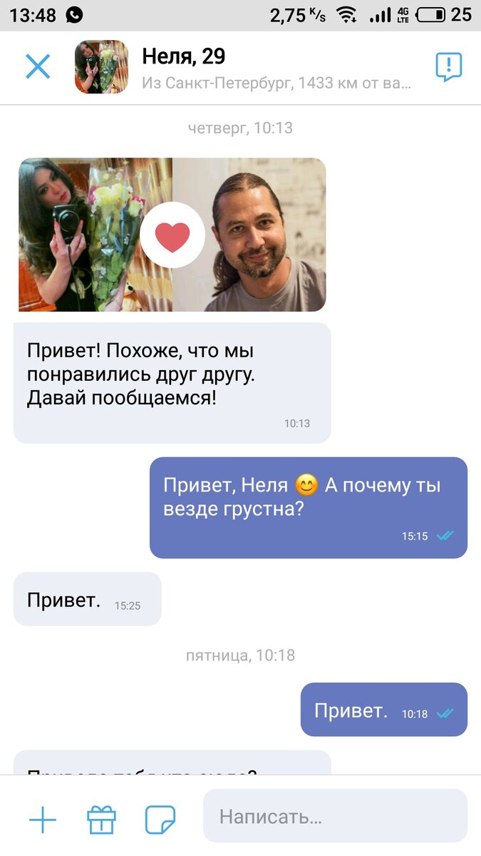 Как видно, с первого же сообщения начались странности, потому что "девушка" проигнорировала вопрос.