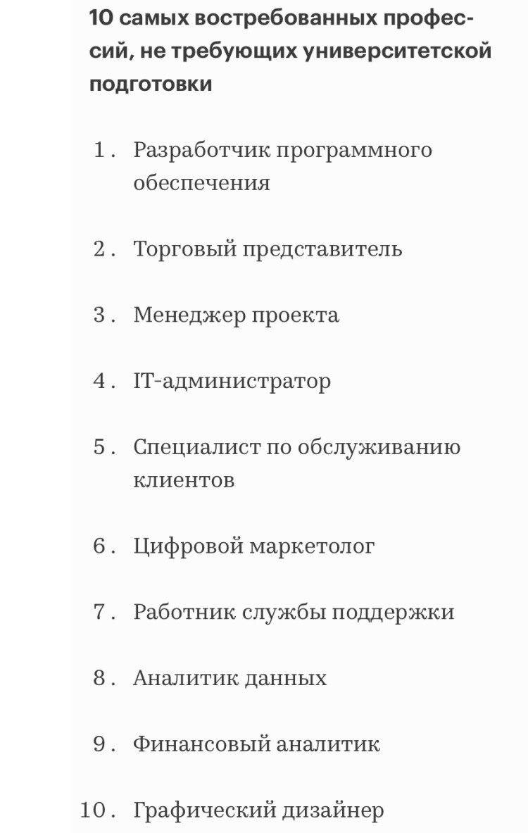 А этот пост для тех, кто уже работает, но хочет что-то поменять в свой жизни. LinkedIn составил список самых востребованных профессий, для которых не нужно высшее образование. Впрочем, на них все равно придётся учиться и постоянно совершенствоваться.