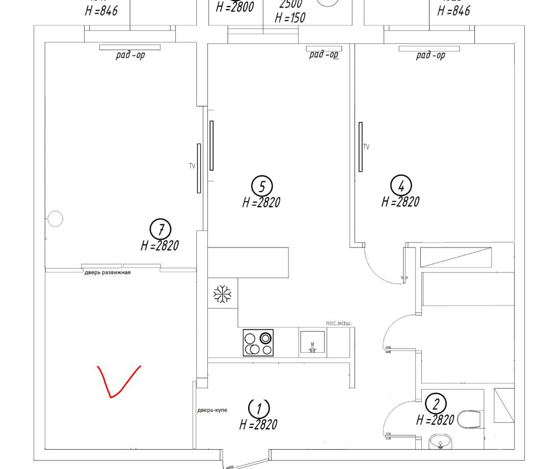 Длинное помещение разделено таким образом, что гардеробная получилась проходной к спальне. Отделяют же их друг от друга двери-купе.