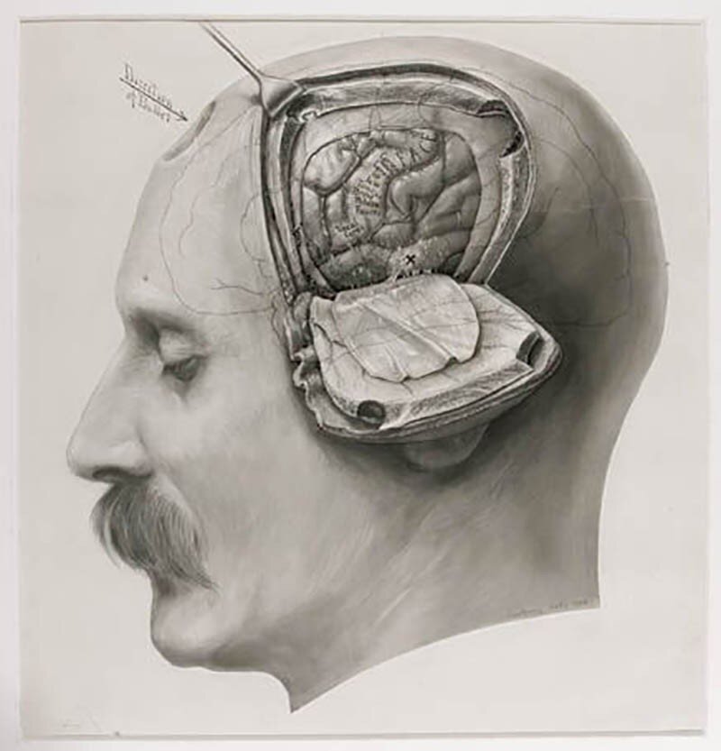 Перед вами — очень необычный рисунок. Казалось бы, что здесь такого? Обычный анатомический рисунок начала ХХ века (он нарисован в 1906 году), изображающий голову мужчины с открытой моторной корой во время операции по поводу травматического поражения головного мозга. Однако это рисунок принадлежит карандашу очень талантливого человека, в первую очередь прославившегося как пионер в хирургии мозга.