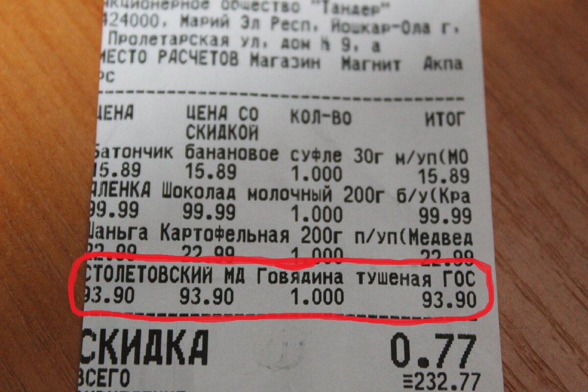Не так давно, в Магните, попалась мне на глаза баночка говядины тушеной, высшего сорта, стоимостью чуть более 90 рублей.