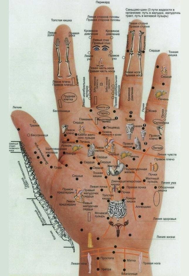 Ладони наших рук представляют голографическую картинку всего организма. Они как листья дерева, отражающие состояние корней – наших органов. 12 меридианов расположены на обеих руках. Меридианы это каналы в организме, по которой жизненная энергия, как говорят, течет .. и массаж, и надавливание на эти точки открывает поток энергии по всему организму .. и дает возможность исцелению и поддержанию здоровья физического, психического и .. энергетического тела. Эта схема и техника рефлексотерапии рук и массажа меридианных точек показывает нам, где и как использовать нашу собственную личную энергию и взять на себя ответственность за свое здоровье. Техника Вы можете использовать все эти методы в одной сессии, или только один метод, например, нажатие или два метода, например, растирание и нажатие. 1. Растирание: Начните с быстрого потирания ладоней друг об дружку, чтобы разогреть их и активировать энергию (Ци). Также разотрите внешнюю сторону каждой руки (в том числе пальцы) ладонью другой руки