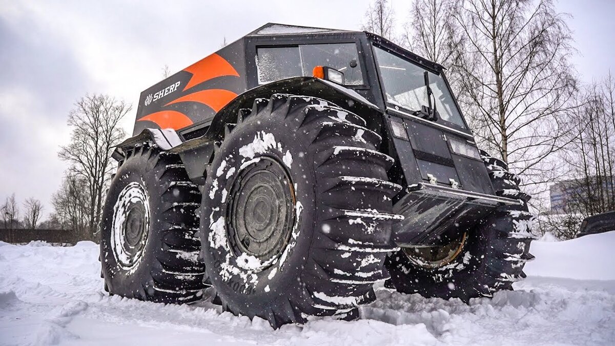 Вездеход SHERP – это маленький российский внедорожник, который развивает скорость в 45 км/ч. Он способен передвигаться и по воде с небольшой скорость не более 8 км/ч.