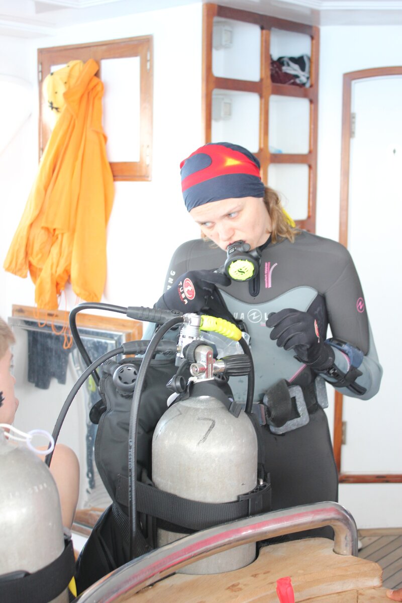 Исторически так сложилось, что весь комплект снаряжения для дайвинга у нас был только в одном экземпляре, и вовсе не для меня. Т.к. я весьма стандартная, и я не видела ничего зазорного нырять в прокатном оборудовании. Муж же был слегка нестандартный. Т.е. не во всяком дайв-центре в наличии был жилет 3ХL размера, и ласты 46-го… И частенько такое случалось, что прокатное оборудование висело на мне, как седло на корове. Так было и в тот раз. Пока жилет был надут, я вроде как плотно в нем сидела, но стоило его сдуть и уйти на глубину, как он начал болтаться на мне, как будто я отобрала его в неравном бою у человека, в 2 раза меня толще. Я зверушка неприхотливая, и меня это абсолютно не напрягало. Дрейфуем в течении, любуемся по сторонам кораллами и живностью, я внизу, муж сверху. И в какой то момент я получаю удар по голове чем то тяжелым. Борясь с нахлынувшими звездочками в глазах, мерзким свистом в ушах, желанием упасть в обморок и разреветься прямо тут, на дне моря, показываю что мне