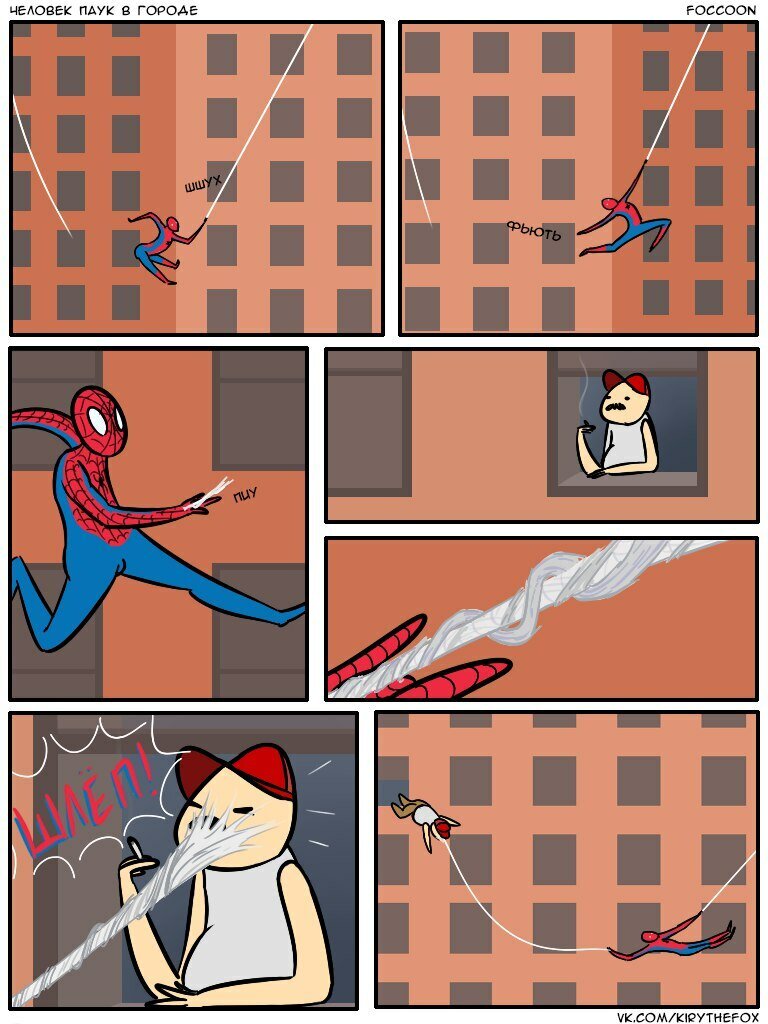 Человек-паук уже много лет является одним из самых популярных героев супергеройских комиксов - фильмы о нем выходят с завидной регулярностью, компьютерные игры с его участием то и дело появляются на полках магазинов, а сетевые художники вновь и вновь посвящают ему свои работы. И раз уж дружелюбный сосед Человек-паук все еще так популярен в мире, почему бы не сделать о нем подборку юмористических комиксов? Тем более, что выбрать определенно есть из чего - при составлении статьи мои глаза так и разбегались от разнообразия сюжетов, но я, конечно же, постарался отобрать для вас самое смешное. Казалось бы, что может быть более захватывающим, чем летать по городу на паутине? Само собой, обычному человеку подобные ощущения вряд ли светят, но можно хотя бы порассекать по Нью-Йорку в виртуальном мире той же «Marvel's Spider-Man» на Playstation 4. Все же, несмотря на всю прелесть свободного «паучьего» полета, в этом деле могут случаться и неожиданности, что, кстати, подтверждает комикс от Focc