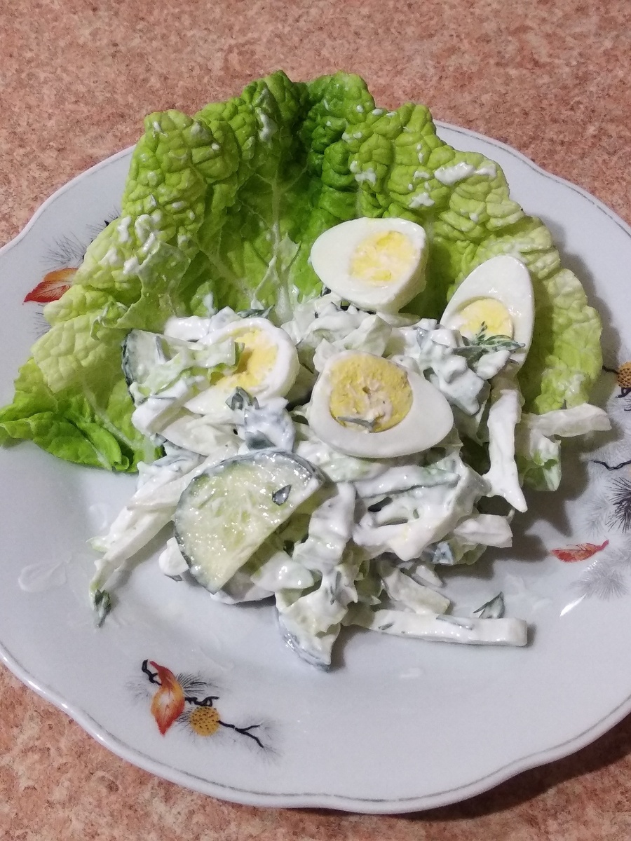 Быстрый и лёгкий в приготовлении, но при этом очень вкусный. Ингредиенты: 🍥 Перепелиные яйца - 7 шт 🍥 Огурец - 1 шт 🍥 Китайский салат - 1 лист. 🍥 Укроп - 20гр 🍥 Сметана - 1 ст.ложка Начинаем готовить: 🍬 Яйца отварить, почистить, порезать пополам. 🍬 Огурец, укроп и китайскую капусту порезать. 🍬 Все сложить в салатник и добавить сметану, соль. Перемешать. Приятного аппетита!
