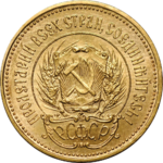 Реверс: содержит изображение крестьянина-сеятеля на фоне плуга, восходящего солнца и заводов. Над фигурой крестьянина-сеятеля надпись: ОДИН ЧЕРВОНЕЦ. Снизу слева – год чеканки монеты. Кант по всей окружности также украшен точечным орнаментом.