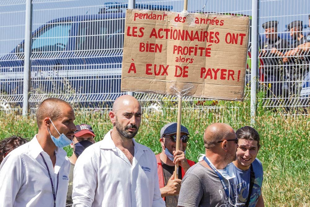 Объём производства Airbus упал на 40%. Компания объявила о беспрецедентном сокращении 15000 рабочих мест в Европе, из них 3500 на заводе в Тулузе, городе, чья экономика в значительной степени зависит от авиакосмической отрасли. В ответ по призыву профсоюзов тысячи человек вышли на улицы, требуя пересмотреть план сокращений. По их мнению, многомиллиардные субсидии, которые получила отрасль, должны предоставляться при условии максимального сохранения занятости.