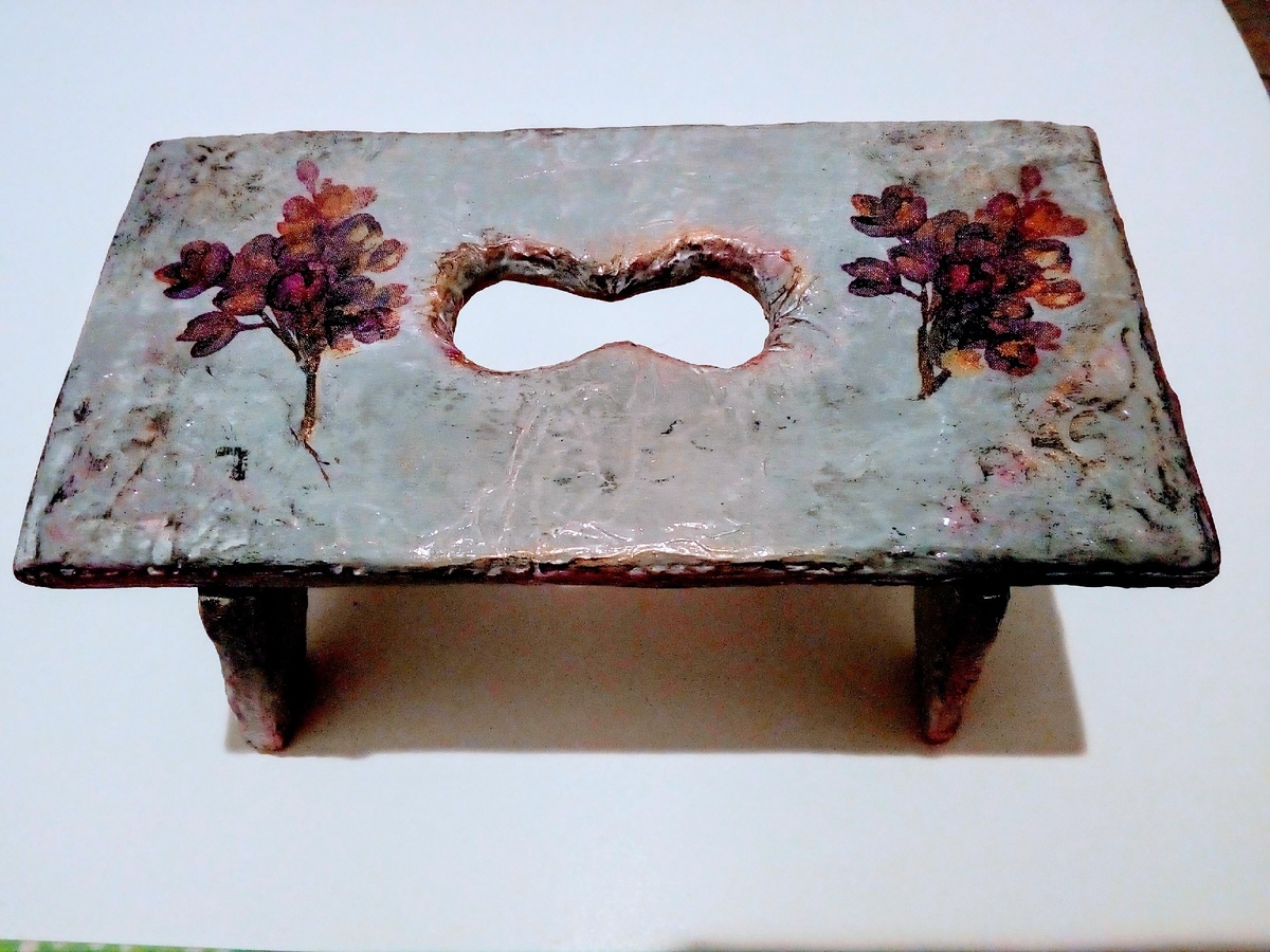 Здравствуйте, друзья! Понадобилась мне маленькая скамеечка для декора моей винтажной кухни, конечно, на кухне моей только ее и не хватало... Но простые чайные баночки, которые стояли на полке вместе с красивым фарфором, хоть и подходили по дизайну и цвету, нарушали достоинство самой порцеллановой посуды. Знаете, как свой среди чужих... Да и тянуться за ними каждый раз не очень-то хотелось. Заваривая свой любимый вечерний чай, всегда думала о том, что их надо переселить вниз, на стол, в уголок, где живут собратья по чайным штучкам. Да и в подвесном шкафу, где хранится пакетированный чай, места этим баночкам нет. На столе им место нашлось , но баночки небольшие по размеру и хотелось поднять их повыше, поэтому и придумала я такую скамеечку. Все можно купить в магазине, если поискать, но зачем покупать, если можно попробовать сделать самим, тем более, что это так просто. Материалы для изготовления совсем простые: картон, клей ПВА, акриловые краски, немного шпатлевки, салфетки дл