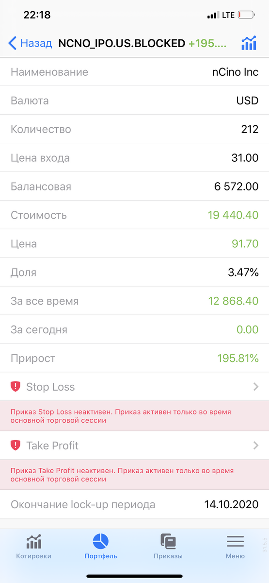 Отчёт: Заявка на IPO nCino была 75 000 дол. Аллокация составила 8,76% т.е. мне удалось купить на 6572 дол. (212 акций ) Стоимость акции на ipo 31$ после выхода на биржу Nasdaq акции стали стоить 91.20$ Рост в первый день торгов +195.81% если в деньгах то +12 868 дол.