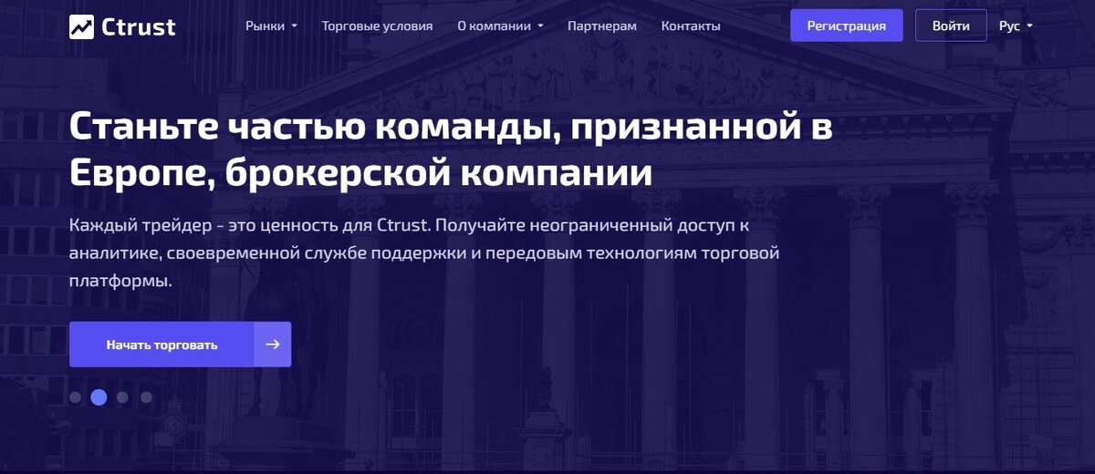 Легенда довольно примитивная. На главной странице написано, что Ctrust — это ведущий CFD-брокер. Клиенты компании якобы получают компетентную поддержку от персональных менеджеров, а условия торговли на площадке намного выгоднее, чем у международных брокеров из ТОП-50.