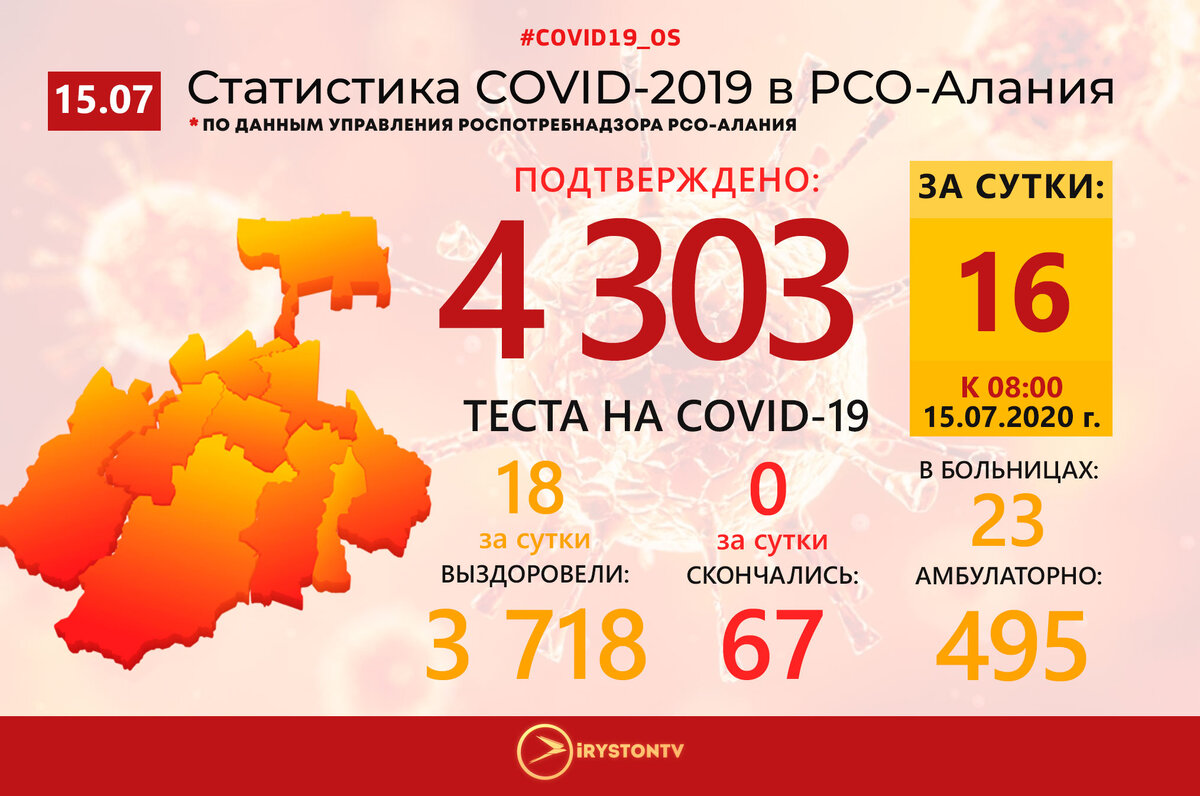 4 303 (16 за сутки) положительный тест на COVID-19 подтвержден к 15 июля 08:00 (Мск) по данным Роспотребнадзора РСО-Алания. 495 человек находятся на амбулаторном лечении. 23 человека проходят лечение в мед. учреждениях республики. 3 718 (18 за сутки) человек выздоровели. 67 (0 за сутки) человек скончались. Уважаемые жители Северной Осетии! Просим вас соблюдать режим самоизоляции! При наличии температуры и признаков ОРВИ вам необходимо вызвать скорую помощь или врача на дом из поликлиники по месту жительства. Оставайтесь дома и будьте здоровы!