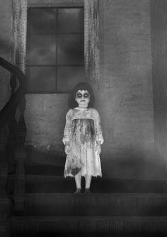 Она была одета в белое платье, белые носки и черные туфли. У неё были длинные, черные волосы, и в руках она держала куклу. У куклы были длинные, черные волосы и одета она была в белое платье, прямо как девочка. На самом деле кукла выглядела, как миниатюрная версия девочки.