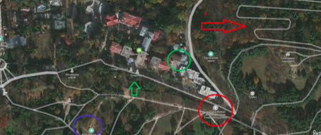 Красный круг – это сейчас часовня, раньше была телефонная станция санатория, сделанная в классическом стиле, правда раньше купола не было – барабан сверху это недавняя пристройка.