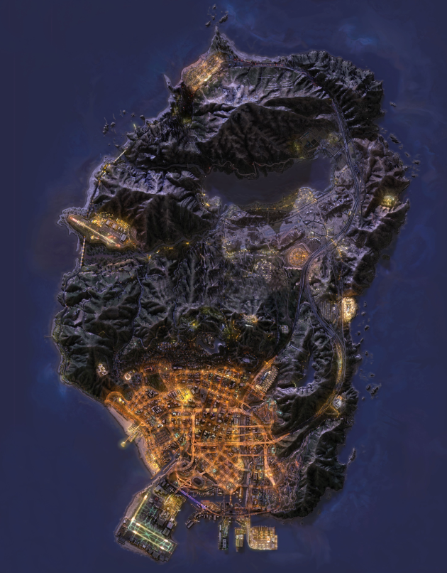 Это настоящий криминальный центр, который вобрал в себя некоторые части мегаполиса, но при этом не стал точной копией. Общий вид карты GTA V Создатели добавили много уникальных элементов, из-за чего смотрится населенный пункт достаточно свежо. Карта в ГТА 5 остальных частей представляет собой малоосвоенную территорию с разнообразными природными ландшафтами. По краям это пляжи, в середине холмистый и равнинный рельеф с растительностью. Дороги разного рода пересекают локации вдоль и поперёк.