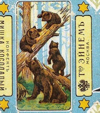 Шоколадный символ СССР – конфета «Мишка косолапый» – на самом деле выпускается с конца XIX века. Рецепт и обертка с тех пор практически не изменились. Якобы картина Шишкина «Утро в сосновом лесу» (репродукция) висела у управляющего фабрикой «Эйнем», ну и… Разрабатывая обертку знаменитой конфеты, художник Андреев творчески переработал композицию и колорит знаменитой картины художника Шишкина, медведей на которой писал художник Савицкий.