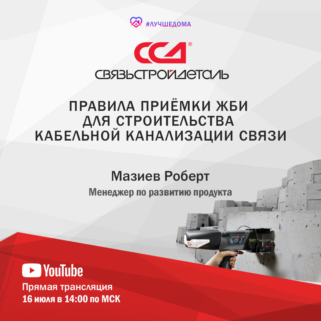 Завтра, 16 июля в 14:00 по Мск приглашаем вас на онлайн-конференцию по теме «Правила приёмки железобетонных изделий для строительства кабельной канализации связи». Во время трансляции мы обсудим следующие аспекты: — Технические характеристики изделий — Конструктивные особенности ЖБИ для строительства кабельной канализации связи — Сопроводительная документация на изделия — Приборы, используемые при входном контроле ЖБИ Готовьте вопросы по теме эфира, задавайте их во время трансляции и делитесь своим опытом с коллегами! Прямая трансляция состоится на нашем YouTube канале и будет доступна по ссылке: https://youtu.be/0sGIkGC81cg Нажмите на колокольчик, чтобы не пропустить начало эфира. Ждем вас 16 июля в 14:00 по Мск, будет интересно!