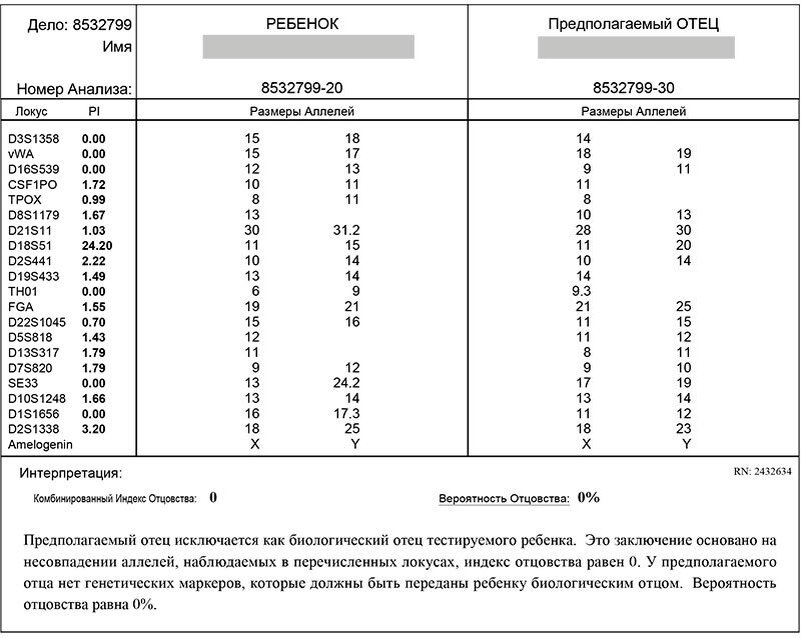 Предполагаемый отец исключается как биологический отец тестируемого ребенка. Это заключение основано на несовпадении аллелей, наблюдаемых в перечисленных локусах. У предполагаемого отца нет генетических маркеров, которые должны быть переданы ребенку биологическим отцом. Вероятность отцовства равна 0% .