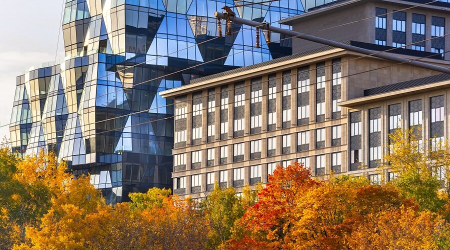 МФК «Искра-Парк» — будто внучатый племянник или прямой наследник выдающихся образцов «большого стиля» 30-50-х годов XX века. С первого взгляда разбегаются глаза от количества деталей, на которые хочется обратить внимание, – здесь сочетаются строгие формы геометрии, а в благородной цветовой гамме фасадов и в качестве отделочного камня вы как раз увидите сходство с шедеврами, созданными в прошлом столетии. Архитектурный ансамбль был бы неполным, если бы авторы проекта не добавили «изюминки» в виде современного делового центра. Его стиль словно вступает в диалог с неоклассическими фасадами жилых корпусов «Искра-Парк».