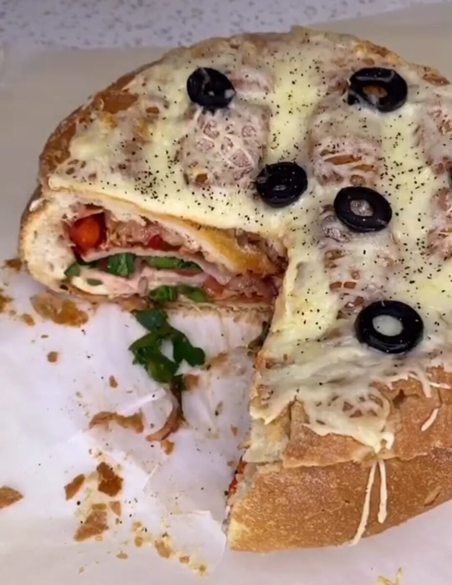 Здравствуйте дорогие друзья! Я тысячикратно извиняюсь за столь долгое свое отсутсвие! (Были небольшие проблемы со связью) Но я спешу Вас обрадовать вкуснейшим рецептом, вкуснейшей штуки!😄 Если честно, то я даже не знаю как правильно эту штуку назвать, но я думаю что название "Пирог-пицца-бургер" подходит лучше всего 😂 Как разрабатывался рецепт: Все очень просто😂 Просто собрали абсолютно все, что было в холодильнике!😄 Но скажу честно, получилось очень вкусно! Так что советую всем попробовать эту вкуснятину!☺ Ну перейдем к рецепту. Берем вот такой круглый хлеб, срезаем шапку и вырезаем мякоть из середины. Аккуратно внутри все выравниваем, прижимаем, подмянаем (руками). На дно кладем томатную пасту, затем сыр, ломтики копченой курицы (ну или колбасу), помидоры, лук (можно побольше), зелень, ветчину, болгарский перец, снова томатная паста и посыпаем тертым сыром. Все эти ингридиенты выкладываем слоями. То есть слой томатной пасты, слой сыра, слой копченостей и так далее... Теперь бере