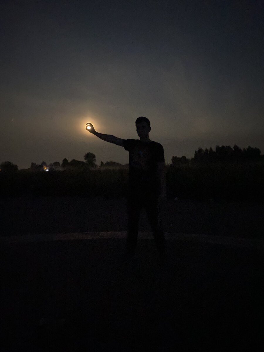 Гулял с девушкой, пришла мысль, сфоткать луну, как будто я её поймал.