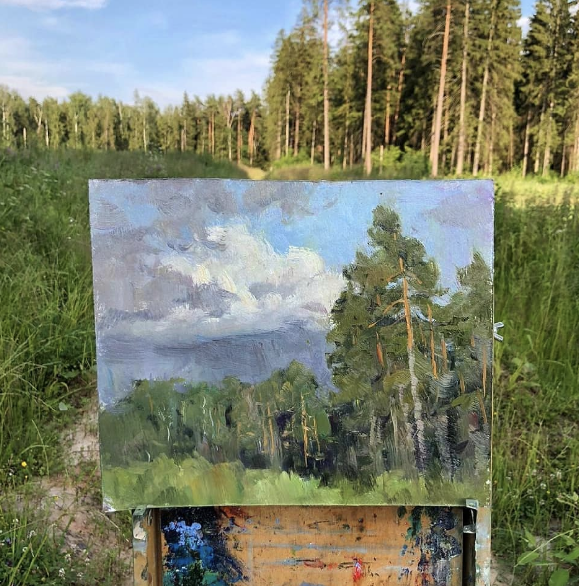 Этюд про сосновый лес и пушистое облако. Стремительно быстрый маленький этюд, про ещё более стремительно неуловимое состояние, когда где-то далеко у горизонта пасмурного дня пробивается лучик света. Однажды, я нашла очень удобную широкую кисть с которой теперь не расстаюсь (она особенная✨). И благодаря этому увлечению я больше никогда не говорю быстрым состояниям "нет", а говорю им "подождите 5 минуточку, я достану кисть") За поездку у меня накопилось много таких маленьких картонов воспоминаний. Еловый вечер из деревенских воспоминаний☀️ Эту троицу я заметила катаясь на велосипеде по округе. Потом я вернулась к ним с холстом и неожиданно со мной случился очень счастливый день. Пока я рисовала, Игорь читал мне книжку, а кисть ходила по холсту легко-легко. Заслушиваясь историями про ведьмака, некогда думать о том, что с работой что-то не так, мысли не путались, а заботливая берёзка закрывала меня от солнца. Этюд про рассвет в деревне🌞 Человек я совсем не утренний, но ради таких моменто