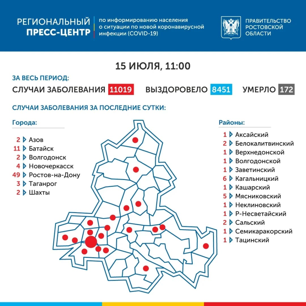COVID-19 за последние 24 часа обнаружили у 97 человек. Это жители 20 городов и районов Дона. Больше всего новых заражённых в Ростове-на-Дону (49), Батайске (11), Кагальницком (6) и Мясниковском (5) районах.
