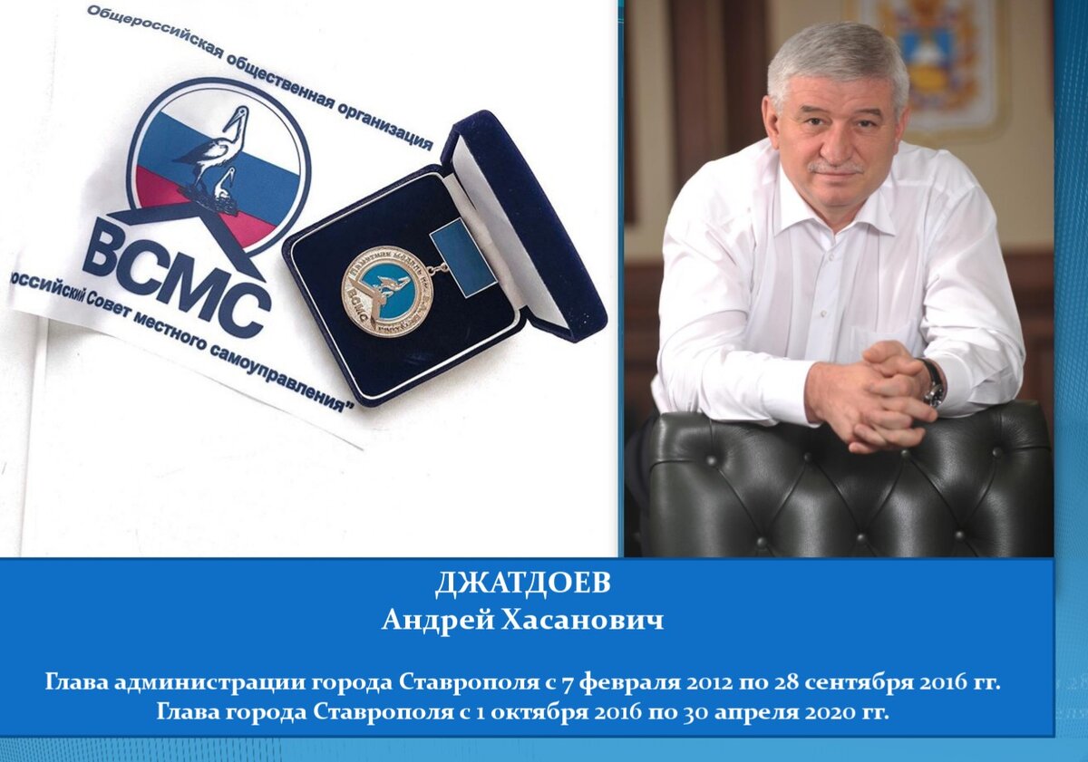 К награде представлен мэр города Ставрополя Андрей Хасанович Джатдоев (посмертно). Ежегодно ее вручают лучшим руководителям муниципальных образований, которые самоотверженно, порой ценой собственной жизни, защищают интересы страны. Медаль имени Владимира Петухова вдове Андрея Джатдоева вручила член Центрального Совета ВСМС, Первый заместитель председателя Комитета Государственной Думы по культуре О.М. Казакова. Она высоко оценила заслуги мэра перед родным городом. «Это оценка коллег Андрея Хасановича. Это было единодушное решение. Для нас это не просто оценка одного человека, это оценка командной работы вместе с правительством Ставропольского края по облагораживанию столицы нашего региона», — отметила Ольга Михайловна. В этот же день, 26 июня 2020 года, за исключительные заслуги перед городом на заседании городской думы Андрею Джатдоеву было присвоено звание «Почетный гражданин города Ставрополя». Об этом сообщил Председатель Думы города Ставрополя Г.С. Колягин. «И это решение не