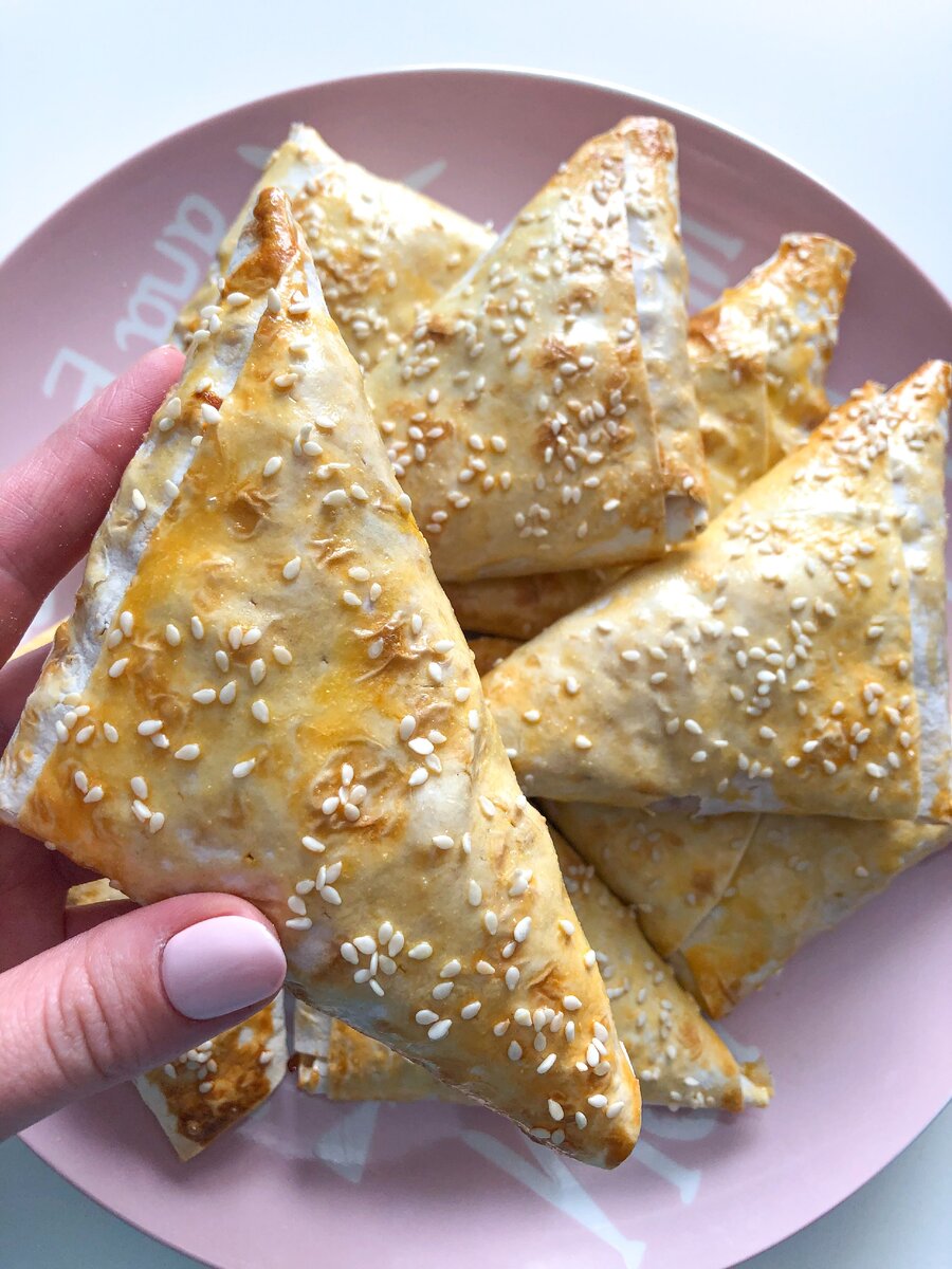 5️⃣ Выкладываем на полоски лаваша капусту, заворачиваем, формируя треугольники