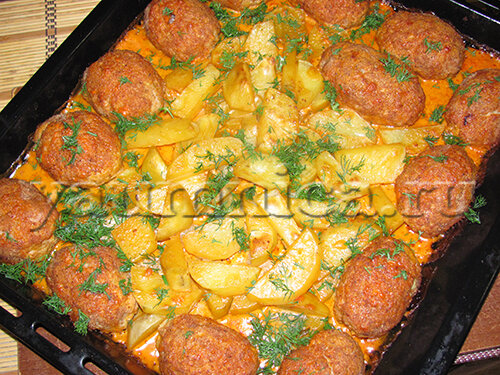 Очень вкусными получаются запеченные в духовке котлеты с картофелем в соусе. Чтобы приготовить это блюдо, нужны вот эти продукты:
