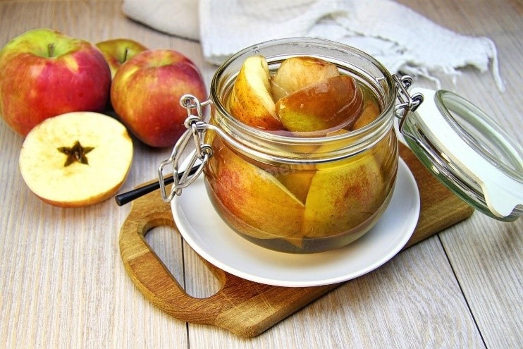 Ингредиенты: Шаг 1: Для заготовки яблок на зиму понадобятся: кисло-сладкие яблоки примерно одинакового размера, питьевая вода из-под крана (будем её кипятить), сахар и лимонная кислота. Шаг 2: Яблоки без царапин и помятостей вымойте под проточной водой и разрежьте каждое на четыре части. Небольшим острым ножом удалите стопки и сердцевину с семенами. Можно заготовить яблоки и половинками. Просто четвертинки будет проще укладывать в банки. Шаг 3: Банки вымойте щеткой с пищевой содой. Яблочные дольки уложите довольно плотно друг к другу, стараясь занять весь полезный объем банки. Шаг 4: В чайнике или в сотейнике вскипятите простую питьевую воду и налейте её прямо в банки. Лить кипяток нужно только в центр, прямо на яблоки, а не напрямую на стекло. Это нужно для того, чтобы банка не лопнула от сильного перепада температур. Шаг 5: Банки прикройте крышками и оставьте при комнатной температуре на двадцать минут. За это время яблоки успеют хорошо прогреться. Шаг 6: Затем во