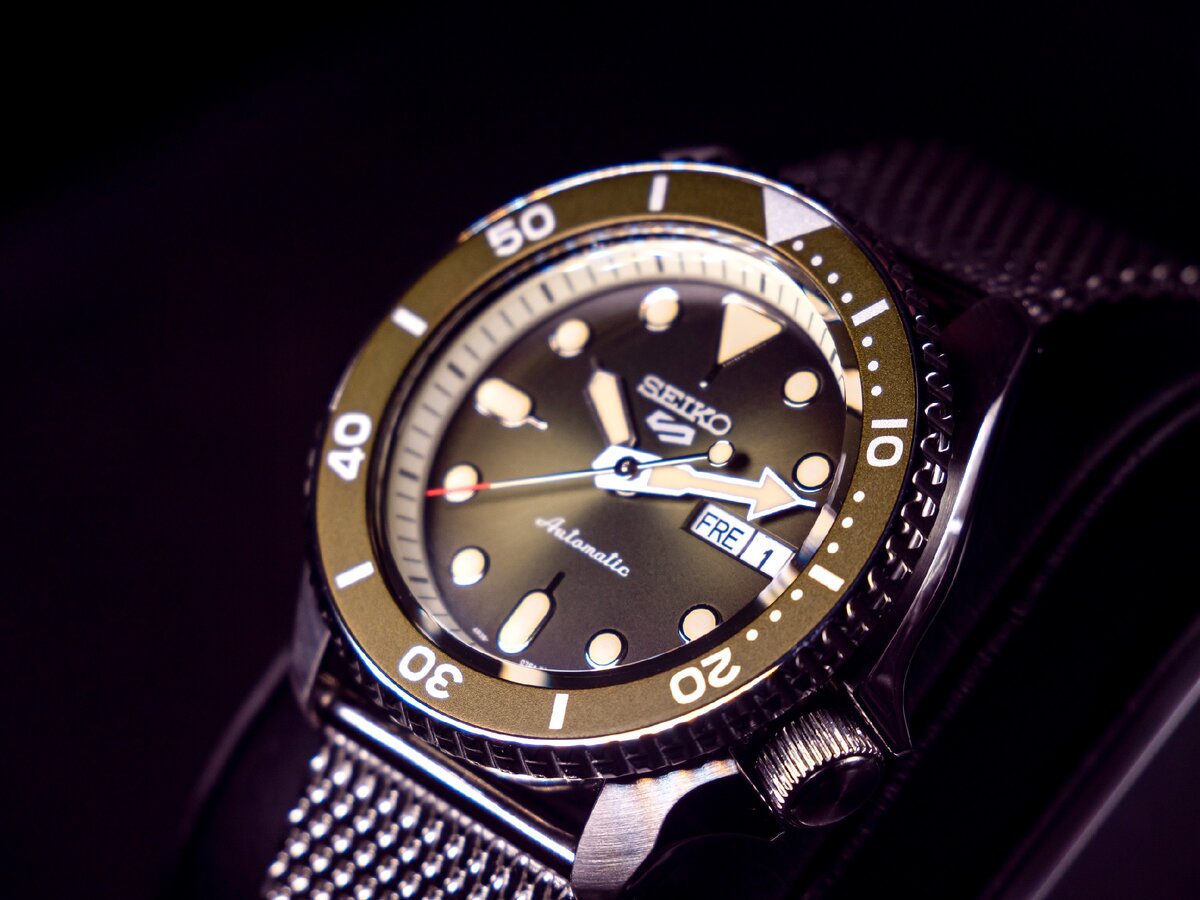 В новом обзоре часов у меня опять оказались японские Seiko. В этот раз модель не ограниченного тиража, но при этом все равно интересная. Часы входят в недавно представленную серию дайверов 5 Sports. Модель получила индекс SRPD75K1. Рекомендую просмотреть видео ниже, где мы обсуждаем нюансы этой модификации. Итак, в новой серии дайверов уже почти дюжина вариантов, которые отличаются цветовыми комбинациями. Много версий на любителя, но сегодняшний смотрится очень даже неплохо. Как вы можете догадаться, главная особенность здесь - зелёный циферблат с эффектом Sunray, который красиво играет на свету. Японцы также изменили вид индексов, они теперь кремового цвета, что немного намекает на старину. Не беспокойтесь - светятся они не хуже обычных. Все основные функции на месте, так что вы получите указатель дат и дня недели. Они белого цвета здесь, что немного выбивается из общей палитры. На месте все типичные признаки японских дайверов - крупный полированный корпус с коронкой в районе отметк