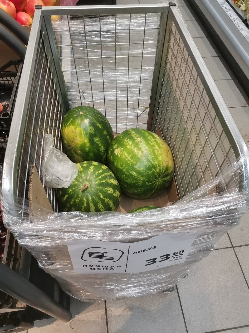 Потом заприметила арбузы в "Магните", на вид они красивые и хорошие, цена заметно ниже - не выдержала и купила еще и тут. И ведь арбуз был таким же сладким и спелым, поэтому низкая цена оказалась не показателем качества.