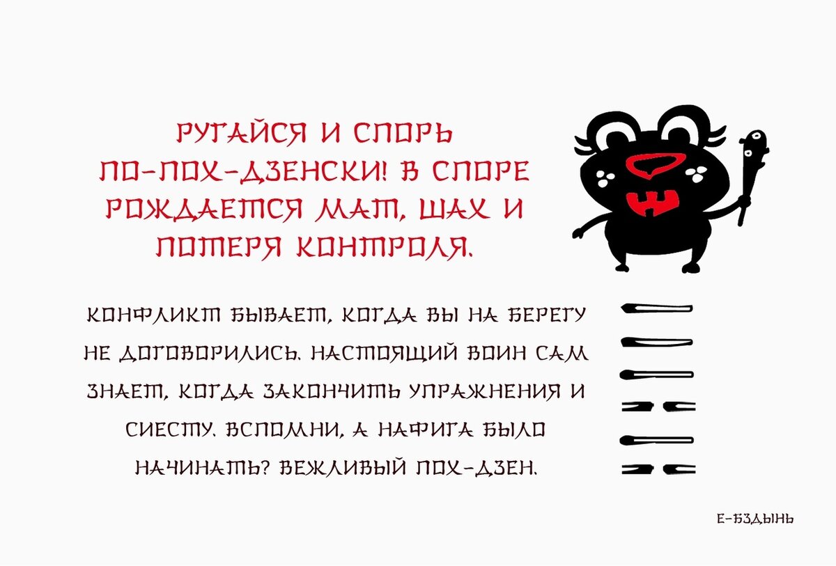 В колоде 64 карты, гексаграммы, тексты хулиганского содержания и картинки с эмоциональными персонажами.Есть номера, по которым любители классического И-цзин могут найти древние тексты. Но, Е-БЗДЫНЬ доходчивее.