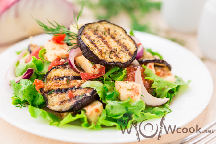 Итак, сегодня у нас вкуснейший тёплый салат с баклажанами и помидорами. Когда я услышала от подруги список ингредиентов, я подумала, что это вряд ли может быть вкусным. И как же я ошибалась! Вкус потрясающий! Подписывайтесь, чтоб не потерять рецепт. Рецепт тёплого салата-гриль с баклажанами Баклажаны моем и нарезаем кружочками. Посыпаем солью. Оставляем на 10 минут, чтобы они пустили сок, с которым выйдет вся горечь. Затем сливаем сок и слегка споласкиваем водой. Тем временем брынзу нарезаем кубиками 1-2 см. Измельчаем зелень укропа, рвем руками листья салата, режем лук. Все складываем в миску для салата. Сковороду гриль смазываем тонким слоем растительного масла. Можно жарить и без масла, но так овощи получатся суховатыми. Разогреваем, выкладываем кружочки баклажан. Обжариваем по 1-3 минуты с каждой стороны, до мягкости и красивого рисунка. Помидоры выбираем плотные. Нарезаем их и обжариваем на сковороде-гриль по 20-30 секунд с каждой стороны. Перемещаем овощи в миску к салату, запр