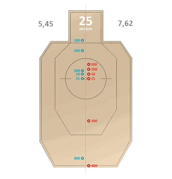 Из инфографики видно как работают пристрелки на различных дистанциях. Беспроигрышный вариант это выверка на 200, но в городских условиях найти тир с такой дистанцией довольно сложно, по этому для 5,45 логичным будет пристреляться на 50 метров, а для 7,62 хватит 25.