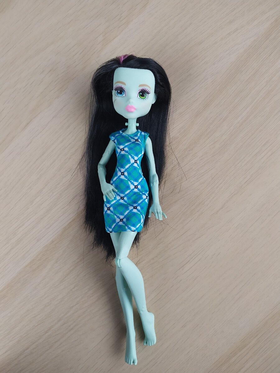 Привет! Меня зовут Александра. У меня есть хобби - я люблю шить игрушки и создавать кукол. И совсем недавно я познакомилась с новым для себя направлением в кукольном творчестве - ООАКом. Это преображение заводских кукол, создание абсолютно нового и неповторимого образа. Свой второй ООАК я решила делать на кукле Монстер Хай. В прошлой статье я рассказывала о том, как она мне досталась. Знакомьтесь - Френки Штейн. Девочка очень красивая. Руки у нее с упрощённой артикуляцией. Насколько я поняла, таких куколок Меттел начал производить для маленьких детей. У них более детские, радостные личики и руки без шарниров, что делает куколку более прочной для детских игр. Ну и цена, соответственно, более бюджетная. В шее тоже упрощëнный шарнир, без якоря, поэтому Френки не может наклонять голову. На руках и ногах шрамы не нарисованы, а молдированы. Это, конечно, мне не очень понравилось. Зато шарниры в ногах в прекрасном состоянии, тугие. И, вообще, куколка в отличном состоянии, не заиграна ребе